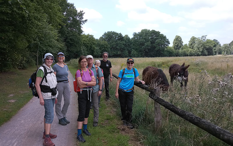 Die Wanderung führte uns vom Start direkt zum Lippe-Steilufer. Danach folgte ein langer Wald reicher Abschnitt bis wir zum Olfener Naturfreibad gelangten wo wir auf zwei Storche vom Hohe-Mark-Steig traffen. Weiter führte uns die Wanderung zu den Stever-Auen wo wir Heckrinder, Poitou Esel, Konikpferde und Storche gesehen haben. Anschließend unterquerten wir die Dreibogen und kamen über die Alte Fahrt (der alte Dortmund-Ems-Kanal 1899 – ca. 1937) nach Olfen. Nach einem etwas längeren Stopp in einem Eiscafé ging es wieder weiter über den Standrand von Olfen Richtung Lippe bis zum Startpunkt.